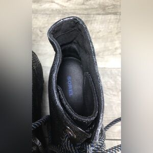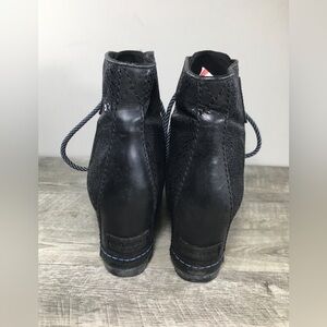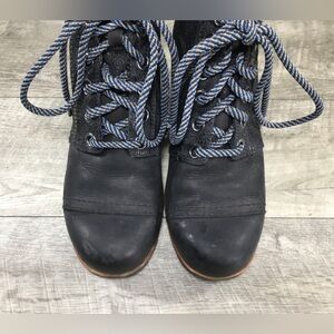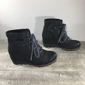 Up for sale is a good condition pair of Sorel Womens NL2264 Black Leather Premium Hidden Wedge Ankle Boots. Size 10. Rubber soles. Canvas and leather uppers. From smoke-free home. Approximate Outsole Dimensions: 10.25 inches heel to toe by 3.75 inches across the ball of footwear by 2 inches tall heels by 7.75 inches tall.