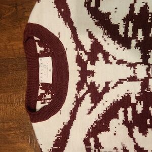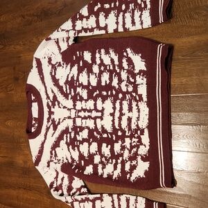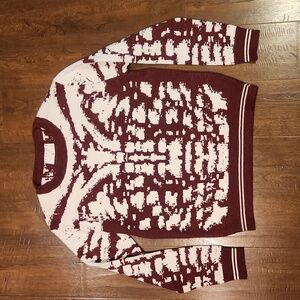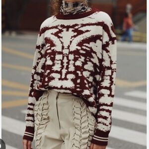 In new condition. Never worn but removed tags. The Fiorella sweater features an abstract brownish red-white and blue-white print with a crew neck, dropped shoulders and long sleeves. Ribbed trims with a striped pattern add a stylish contrast. Designed for a relaxed fit, it offers versatility for layering or wearing on its own with ease.
