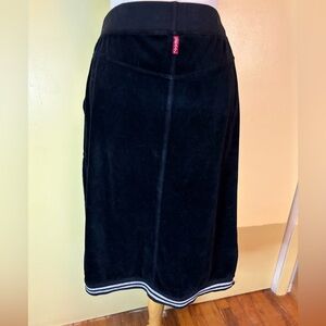 Cotton denim. Not much stretch. Mom jeans are high rise and roomy thighs