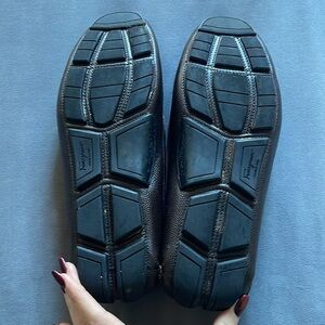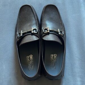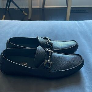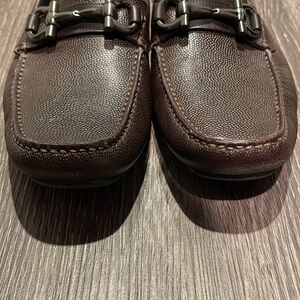 Great condition men’s Ferragamo loafers in a size 10 1/2. Chocolate brown pebble leather with silver buckle. Slight wear at front of shoe, but on the bottom and not noticeable from the top.