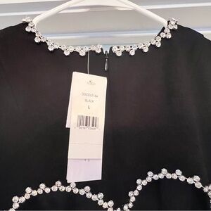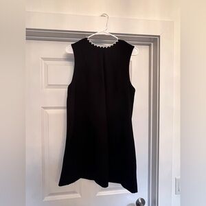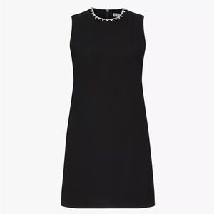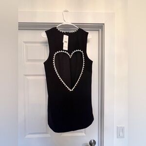 COMPACT PONTE JERSEY SLEEVELESS MINI DRESS FEATURES CRYSTAL TRIM HEART CUTOUT BACK AND SIDE POCKETS.