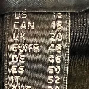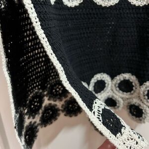 Body hugging classic black dress with unique crochet lace trim on hemline in black and white, 14” wide with slits on both sides. Pull on style with no closure.