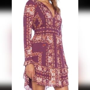 beautiful and colorful Farm Rio dress that buttons up the front. this is not lined button cuffs + belted. worn once. long sleeves, collar neckline with belted waist. 100% viscose, machine washable.