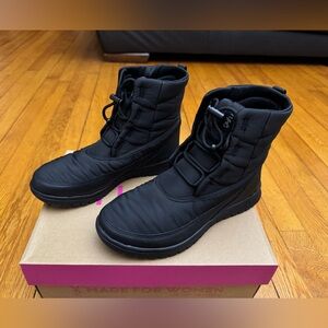 Stay warm and look cool in these sleek and lightweight winter boots. This weatherproof boot has a secure toggle closure, anatomical footbed, round toe, and lightweight EVA in the midsole and sole providing a supportive base. These are super lightweight! Only tried on, not worn outside.