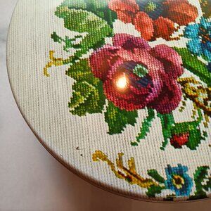 Vintage Round Tin & Lid Needlepoint Floral Design Country Cottage 10 In.