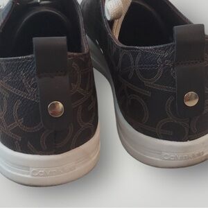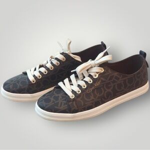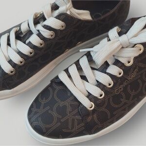 Featuring the signature CK monogram print in a sophisticated dark brown with creamy white accents, these sneakers are perfect for everyday wear or adding a touch of designer flair to your outfit.