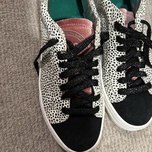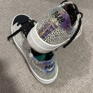You’ll be stopped with complements wearing these super cute and unique sneakers. Black and white animal print, glittery black laces, iridescent P448 on the back heel, mauve velour type tongue, small platform. Size 40.