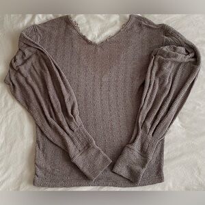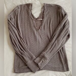 A super cute long sleeve knit top from Free People in a size L. Featuring semi-sheer pointelle, a v-neck with eyelash lace trim, bishop sleeves, and a dropped shoulder. This top is cute on its own, or with a camisole or bralette underneath, and is in excellent condition with no rips, stains, or tears. (The last photo gives you a better idea of the sheerness of the top.)
