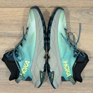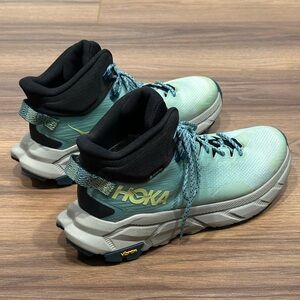 Excellent preowned condition, really nice pair of trail boots from Hoka. No flaws to note, looks like they’ve maybe been worn once, some very slight dirt maybe a slight scuff. 9.5/10 condition. Color is a light green yellow shade with light grey, turquoise and black accents.