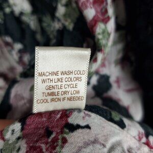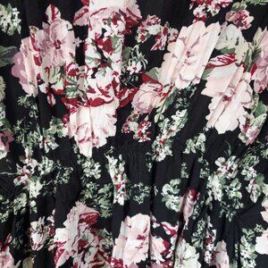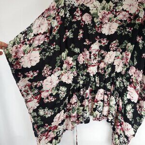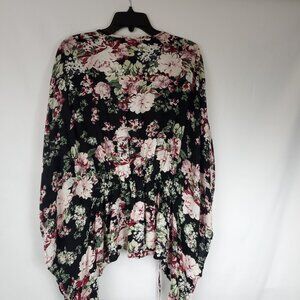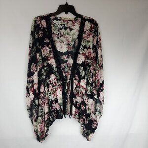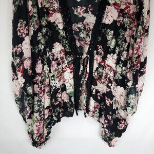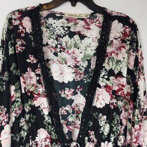 Libery Love Black/Pink Floral Print Tie Front Lace Edge Wmns Sz XL Kimono Blouse