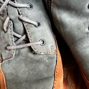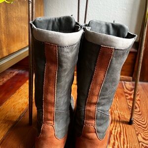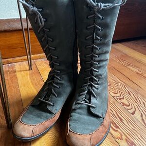 Born leather and suede mid-calf boots. Lace up front with zipper on the side. Gently used in good condition with some color distress near the laces as shown in photos.