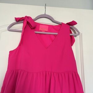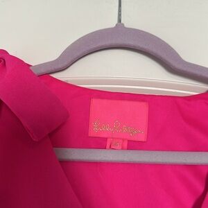 Lilly Pulitzer Blisslyn Dress - Size XS. Excellent used condition. Color is açaí berry. Zippered back. Lined. Flowy with tiers. Sleeves tie into bows. Length hits just above knee. Has pockets.