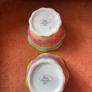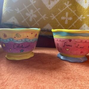 No chips or cracks, beautiful! One says Sweet Live and the other says Celebrate! One interior is blue and one is orchid.