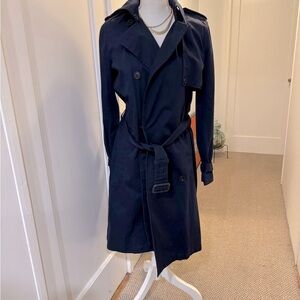This long trench coat by GAP features a deep navy blue color and a wide lapel collar, typical of classic trench coat designs. It includes a belt for cinching at the waist, providing a stylish silhouette.