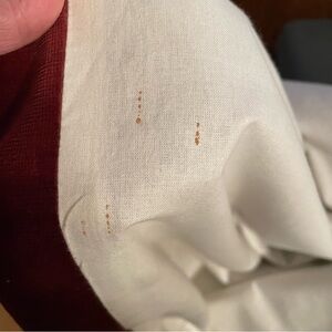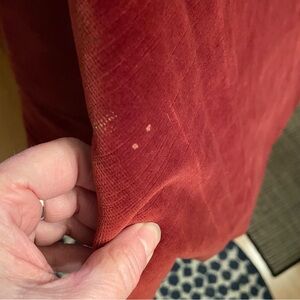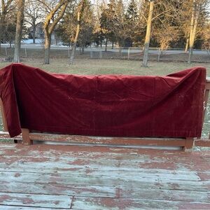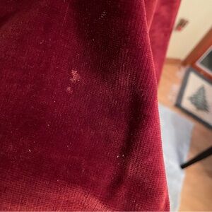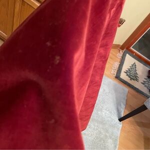 Restoration Hardware(RH) Vintage Heavyweight Velvet Curtain. Red/maroon velvet. Lined -I dont think much light can shine through. Rod pocket. Approximately 100 inches by 84 inches. Some spots on it please see photos. Some spots on the lining please see photos. Discoloration on lower corner see photo. Vintage. Heavyweight.