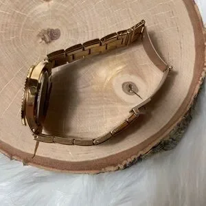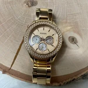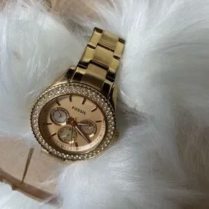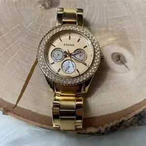 Fossil Stella Glitz Rose-Gold watch. Stainless steel case and bracelet. Fixed rose gold-tone bezel set with crystals. Rose dial with rose gold-tone hands and index hour markers. Minute markers around outer rim. Analog. Sub-dials featuring date, day of the week, and 24 hours. Quartz movement. Pull/push crown. Solid case back. Case diameter: 37mm. Band width: 18mm. Deployment clasp with push button release. Water resistant at 50 meters/165 feet. Minimal scratching due to normal use. All crystals intact. Needs battery. EUC.