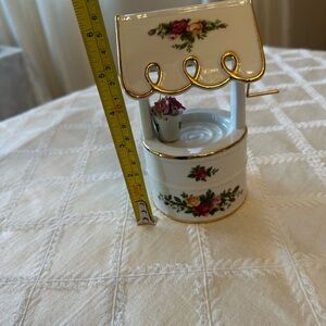 The Royal Albert Old Country Roses Wishing Well Music Box is a decorative collectible music box made by the Royal Albert brand. It features a design inspired by the Old Country Roses pattern and is manufactured in China. The music box plays a melody and is pre-1900 in time period. It is not handmade.
