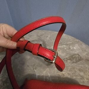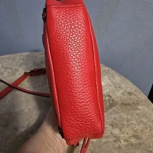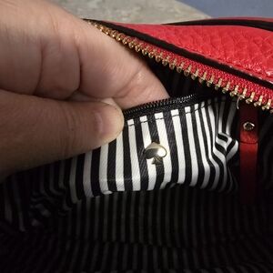 Beautiful Kate Spade red small pebbled leather crossbody bag. The crossbody strap is adjustable. There is a 3/4 zip-around external pocket. The main compartment has a zippered closure and one internal zippered pocket. Black and white striped internal lining. Silver-toned hardware.