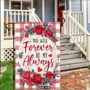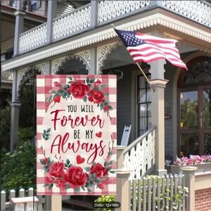 The "You Will Forever Be My Always" Garden Flag is a charming addition to your outdoor space for Valentine's Day. Made of 100% Polyester in a size of 12"x18", this double-sided flag features a romantic message perfect for the occasion. The multicolored flag is machine washable, waterproof, and mold-resistant, making it durable for outdoor use. Its vertical design and holiday theme make it a lovely decorative piece for your yard or garden. The flag would also make a great gift. Flagpole is not included. Ships from US.