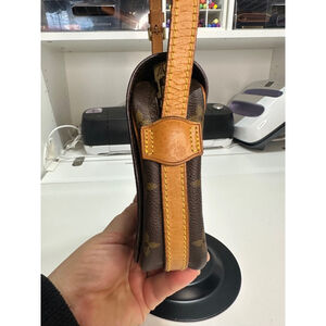 Pre-owned Louis Vuitton Monogram Canvas crossbody bag. The bag features a brown monogram canvas exterior with vachetta leather trim and shoulder strap. Dimensions are approximately 8"W x 6"H x 2"D. The bag has a zipper closure. There is visible discoloration and wear on the vachetta leather. The interior lining shows some dirt. The overall condition shows signs of previous use.