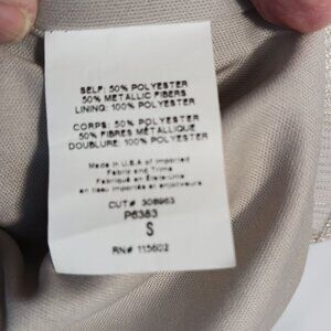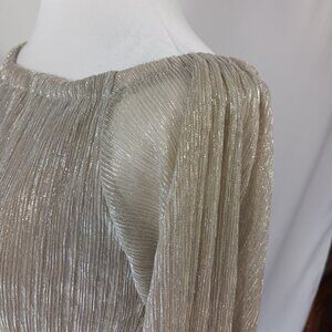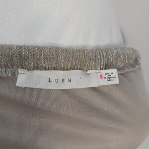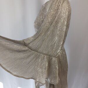 Lush Metallic Gold Romper, Flounce Sleeves, Tie Waist, Fluttering Shorts, Size Small. This sparkly, light weight and soft romper can be worn at shoulder or off shoulder. Fitted elastic waist allows stretch, and the tie adds a beautiful accent. Flounce sleeves are sheer, the rest of the garment is lined. While the color is gold the sparkly metallic fabric shows hints of silver. Excellent pre-owned condition.