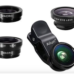 This Ailun camera lens set includes three separate lens attachments designed for mobile devices, featuring a convenient clip-on mechanism for easy attachment. The lenses are made of glass with metal housings and come in different sizes for various functionalities, including a macro lens for close-up photography.