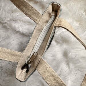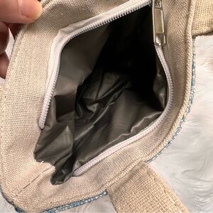 Super cute! Brand new from what I can see. Vintage look. Perfect for a mini purse, but has a tote bag style and shape. Two sturdy handles and a nice zipper.