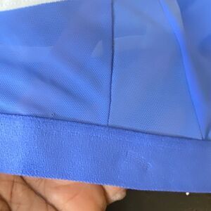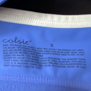 Colsie light blue with white adjustable straps sports bra. Mesh fabric slightly see through throughout. Side to side 13.5in, size small.