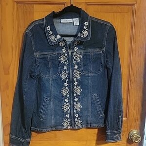 Stylish Chadwicks denim jacket in a classic blue. Features intricate floral embroidery for a unique touch. Perfect for casual outings.This is in excellent condition