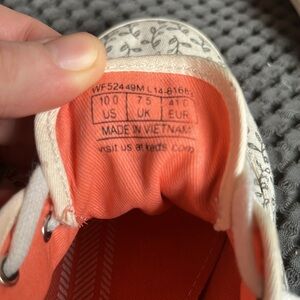 Worn once keds sneaker with black leaf pattern on natural canvas. Orange-pink lining.