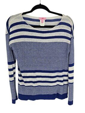 Free people womens small Found my friend Boucle knit Pullover blue white stripe slight balloon sleeve ribbed cuffs Good Preowned Condition May show normal wash wear color may appear differently depending on light Anthro 66170