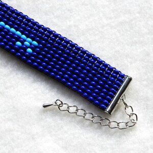 Handmade, handwoven bead loom bracelet made with glass seed beads and nylon thread. Silver-tone lobster-claw clasp and extender chain. Width is 3/4 inch. Length adjustable from 5 3/4 inches to 7 1/2 inches.