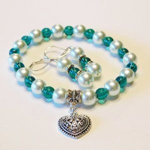 Handmade Green Glass Beaded Stretch Bracelet with Heart Charm & Earrings…