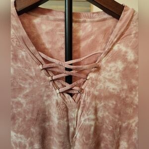 Elevate your casual wardrobe with this stylish pink tie-dye top. Featuring a trendy lace-up front, it's perfect for any occasion. Normal signs of wear.