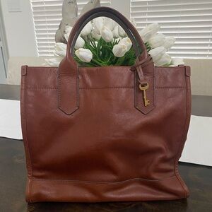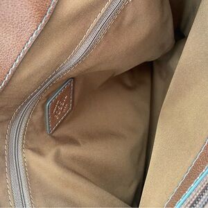 Like new. Real leather. Tote size. Pet free and smoke free home. 2 zippered interior pockets. Zippers in working order. Additional interior compartments for phone or keys and one for a pen. Exterior phone compartment. Clasp closure at the top. Removable and adjustable strap.
