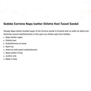 Strappy Napa leather braided upper of the Corinne sandal is finished with an ankle tie detail and bohemian tassel embellishments in this open toe stiletto style from Gedebe.