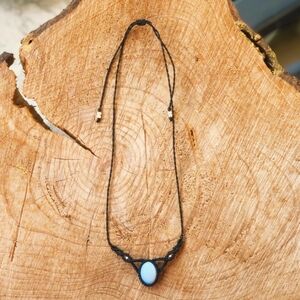 Adjustable macrame choker made with colorfast, waterproof yarn. Closure knot wrapped around both strands is designed to make it short or long. Opal gemstone.
