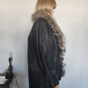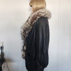 Marvin Richards black leather coat, silver fox fur tuxedo trim, 2 pockets, toggle closure, no size tag, approximately large by measurements. Measurements