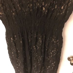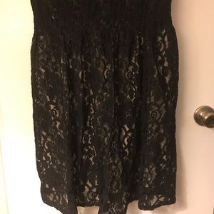 Nude dress base with black lace overlay. Extremely flexible and flattering, lots of elastic to hide those trouble spots. Waist is cinched, and it would look perfect with a belt to really accentuate!