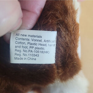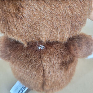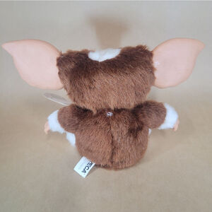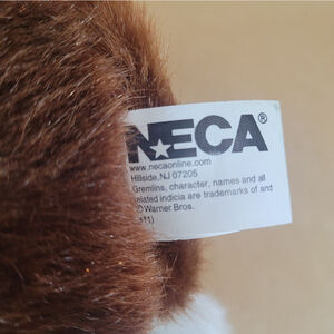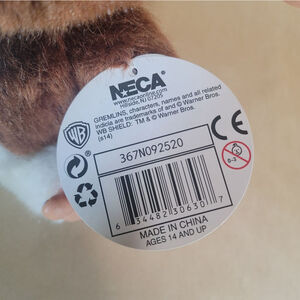 Pre-owned NECA Gremlins plush toy. Brown and white fur, plastic head and feet. Features include embroidered eyes and a stitched mouth. The tag is still attached. There is a small, light-colored spot on the back. Made in China. Materials: Cotton, artificial wool, plastic. Shows minor wear consistent with pre-owned condition.