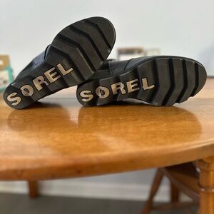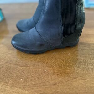 Sorel waterproof leather booties. Wedge heel, great traction, super comfortable.