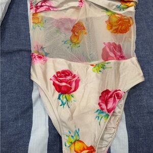 Elegant bathing suit with vibrant floral design. Features sheer mesh detailing. Perfect for a stylish look.shows wear but still in great condition