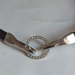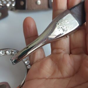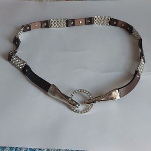 Size 38 Genuine Brown Leather and Rhinestone Paved Silver Tone Panel Linked Belt