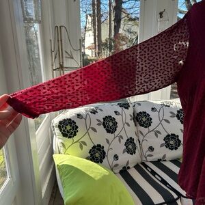 Burgundy long sleeve silk and rayon blouse with tie collar and button front. Pleated bodice creating flowly flair to bottom half of the blouse. The body of the blouse is lined... the sleeves are not and so a nice see through look. One button placket long sleeves.