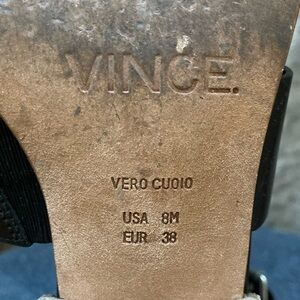 These stylish black sandals by Vince feature wide leather-like straps for a secure fit and a low chunky heel made of light-colored wood for a natural look. The ankle strap with buckle closure ensures adjustability, making them both comfortable and fashionable.