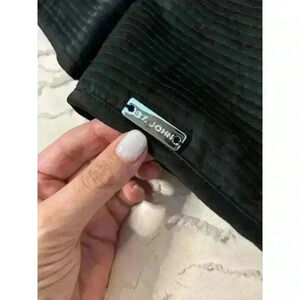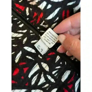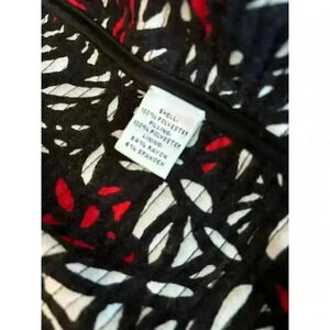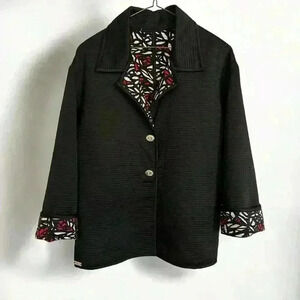 Beautiful black quilted lightweight jacket with red and white designed lined interior. Cuffs and color show lining detailing.