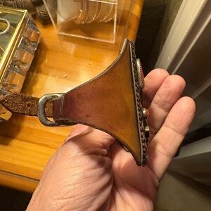 Ladies ketoh cuff with authentic southwestern stones. Turquoise , coral, spiny oyster, onyx , and a few more. It has never been worn. The darker leather on the sides is from sitting . This was purchased at ortegas in Santa Fe many years back and has increased significantly in price .