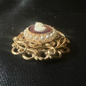 Vintage and unique assuming Faux cameo set on burgundy stone surround by tiny faux seed pearls set on a raised 2 level filigree metal design. Intricate detailing in the gold tone filigree.