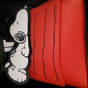 NWOT Peanuts 3 Piece Snoopy Gift Set, red, white, black and yellow. Set includes a crossbody bag with Snoopy lying on top of his dog house and 2 interchangeable bag charms. One is Woodstock. The other is Snoopy's name with pompom.