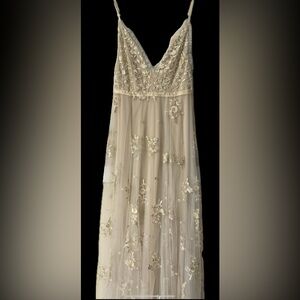 Meant for a 5’5” person or taller with heels! Was too big for my 5’3” 115lb frame. GORGEOUS dress, let me know if you have any questions! Adjustable straps, only tried on once.